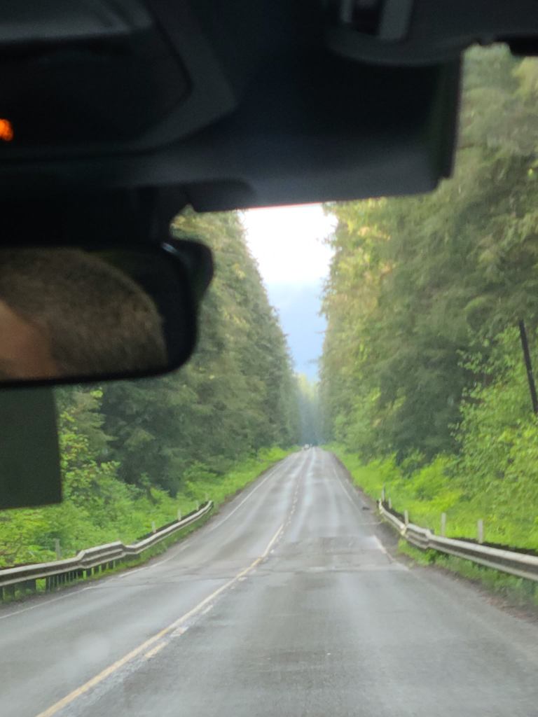 周五下午到达西雅图,灰蒙蒙的天,和朋友和她妈在酒店汇合,开始开往Forks。一路上全是绵延不断的Evergreen Tree,身在其中确实很震撼。刚开始在路上我还稍微有点不以为然,觉得这树加州也见过呀。但是后来越来越往北走,公路越来越窄,两边的树越来越密,我坐在后面从挡风玻璃望出去,树高的完全看不见顶,我要把身子压低才能看见树顶,就像这张照片里面的感觉。