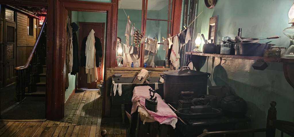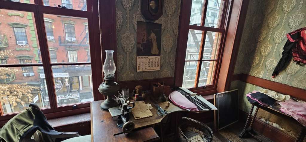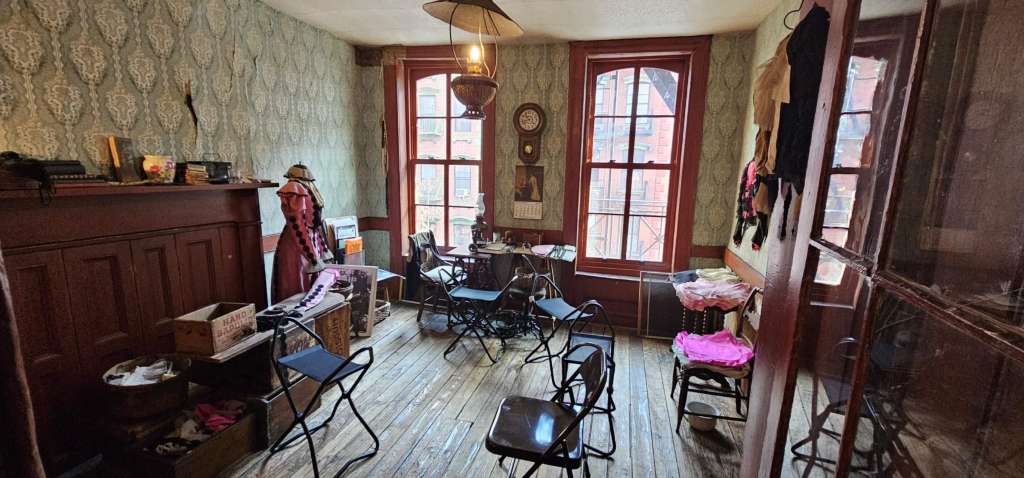 厨房另外一侧就是他们的小作坊,这家人的男主人是裁缝,有一个小作坊,雇了4到5个工人同时在一起做工。当时的美国很多定制的衣服都是在这种家庭作坊里完成的。同时女主人就在旁边的屋子里带孩子,做饭,做家务,在公寓里进出上下,楼里没有厕所,没有水龙头,全部的人要共享室外的4个公厕,和一个水龙头。