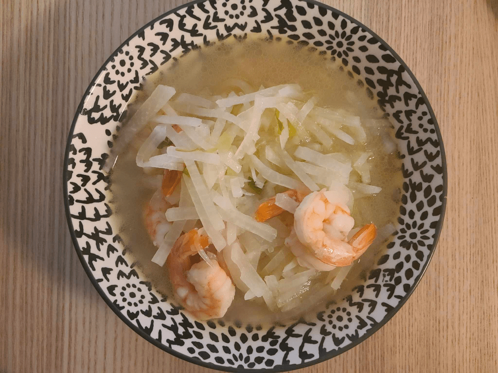 这周除了咖喱和花生酱汤,还新尝试做了:茄子,很失败。年糕,有点太软。白萝卜丝汤,还行吧,勉强放一张照片。