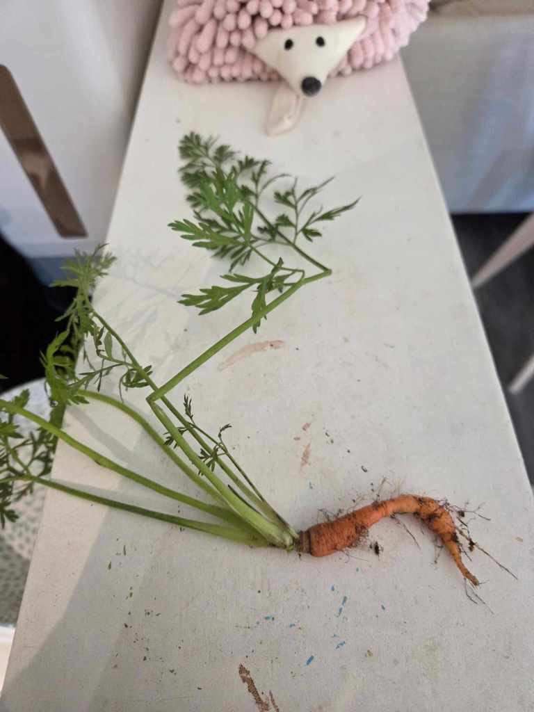 之前种的胡萝卜以失败告终,但是今年发现有一颗存活了下来,我们怀着最低的期望值把它拔了出来,发现是一只超级可爱的小小胡萝卜,哈哈哈。