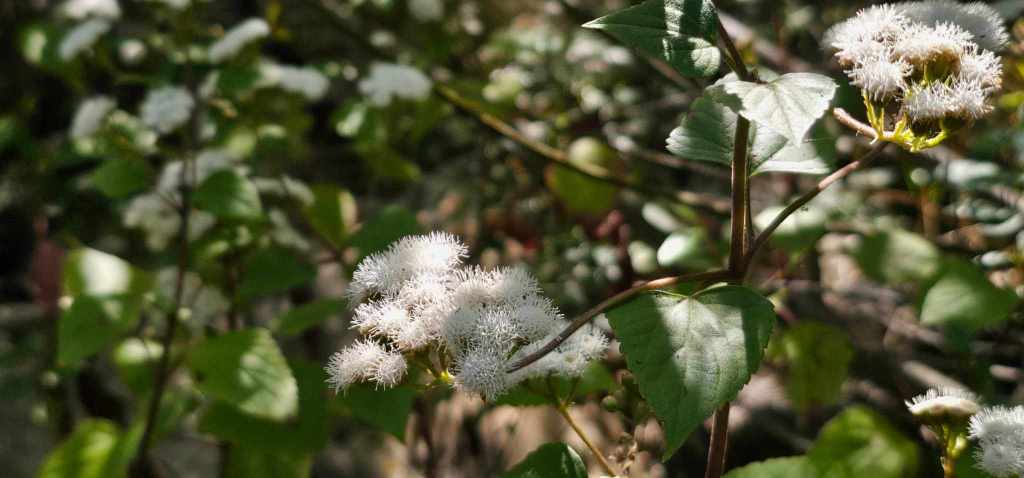 周日从厨房望出去,发现院子里长得非常旺盛的“杂草”植物,居然开花了!激动的冲出去拍了照片。去年种番茄的时候频繁的浇水,这个植物就在番茄旁边默默的冒了出来,当时觉得它就是院子里的杂草,但是看它长的很茁壮就没有管它,结果好多个月过去,番茄都死掉了,它一直长的飞快,还自己开了花!