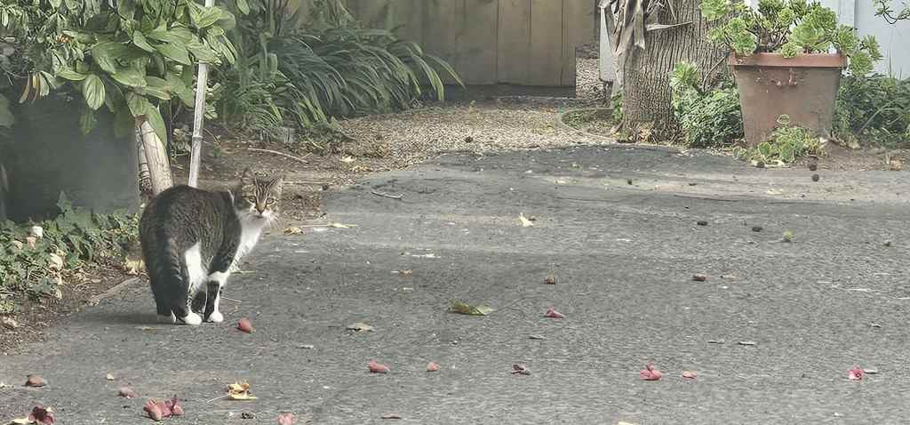它转身跑进院子里,我们进门给它放了一点猫粮,结果它居然很快来吃了,一副很饿的样子。没过一会billy又来了,怕它俩打起来,赶快又放了一盘出去。tabby走了billy接着吃,它走了之后又发现黑猫趴在围墙上。