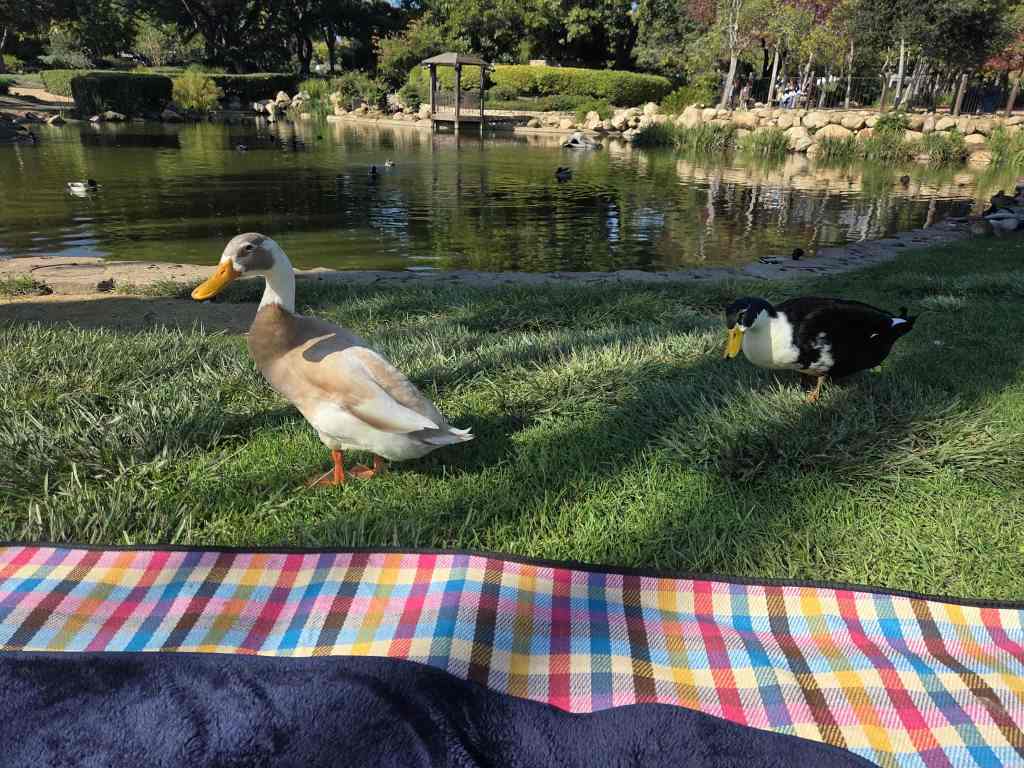 周六去Costco,回来之后跟好久不见的M去鸭子公园躺着聊天,顺便下了两盘棋(我赢了哈哈!),最喜欢的那只鸭子来野餐垫附近闻来闻去,在网上查了鸭子可以吃cracked corn, oats, peas, 有点想带点去喂它们。