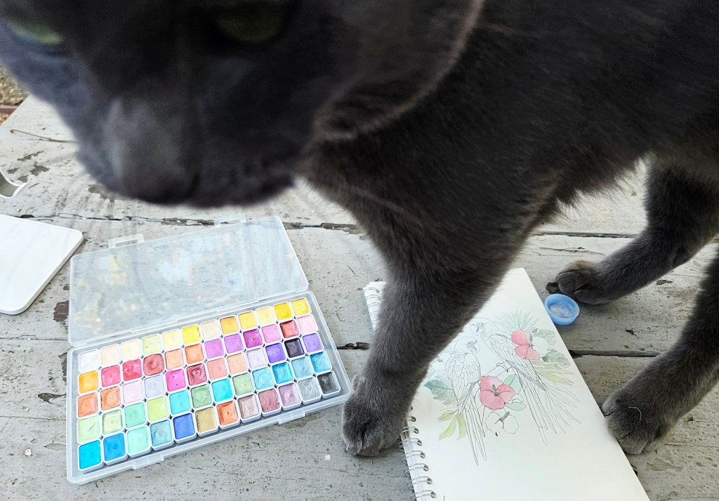 上周末在外面坐着添色,它在旁边睡觉,醒了之后一脚踩上我的颜料盒。