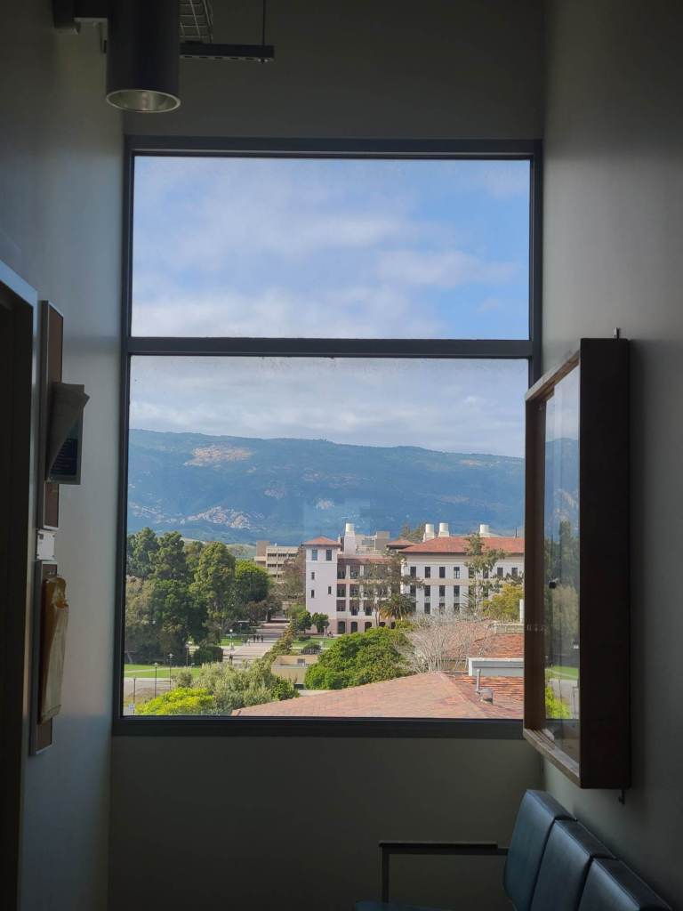 很喜欢这份工作的一点是我有自己的办公室,窗外能看到大海。因为海洋生态系做很多实地研究,所以楼离海很近。周三下班之前在走廊 尽头看到窗外的景色,赶紧拍了下来,真的好美啊。